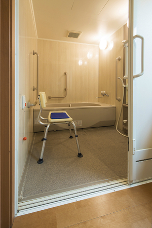 車いすのままで浴槽の近くまで、手すりもあって安全。 |